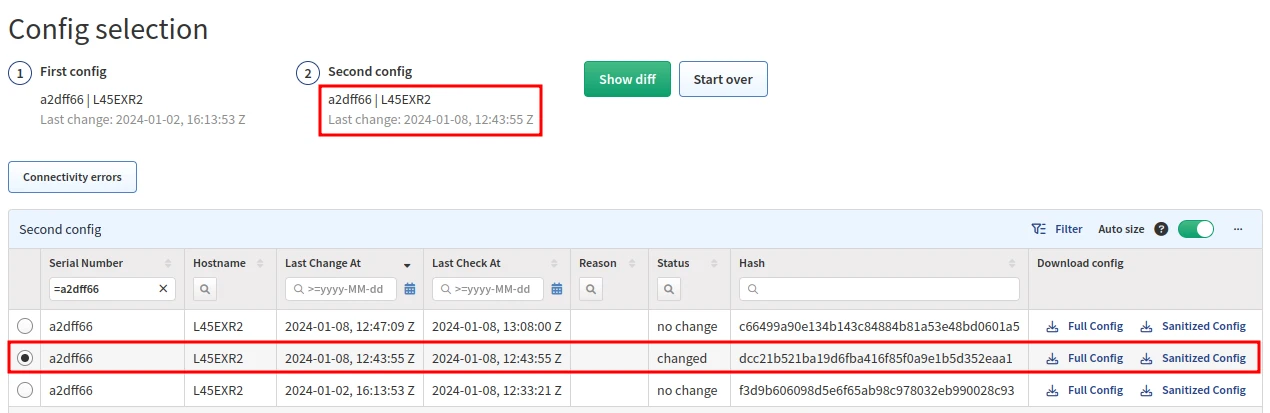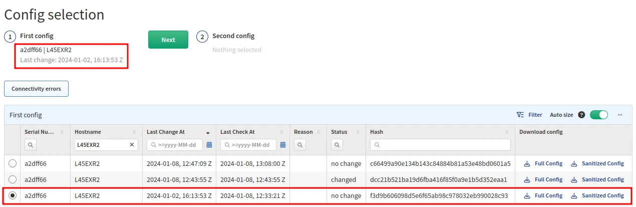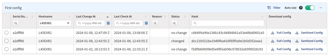 Serial Number– Serial number of the device.Hostname– Device hostname.Last Change At– The last time before the very next config change.Last Check At– The last config file check before the very next configuration change.Status– Config state indicator that tells you whether:changed– The config changed within the last check (initial value).no change– The config did not change within the last check.