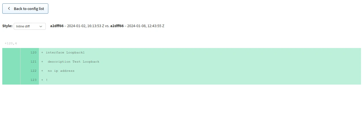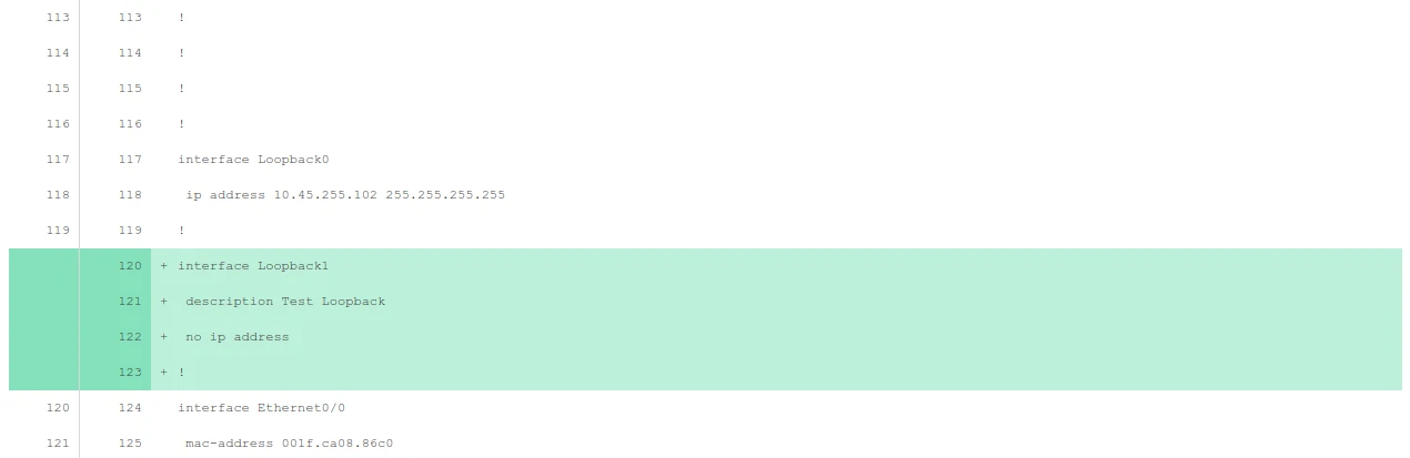 Note that every table row, once you filter output for a specific hostname, represents a modified configuration file. When a new configuration is found (either brand new or different from previous) for a given device, it is committed to git, and the new record is entered into the DB, with status set to changed. Next time the device’s configuration is checked, there are two options:
