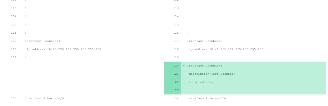 The table can be used to compare between two different configurations directly from the user interface. This is done by selecting the Before and After states to compare, and the resulting differences can be displayed side-by-side, inline with all rows, or inline with only rows where the changes have occurred.