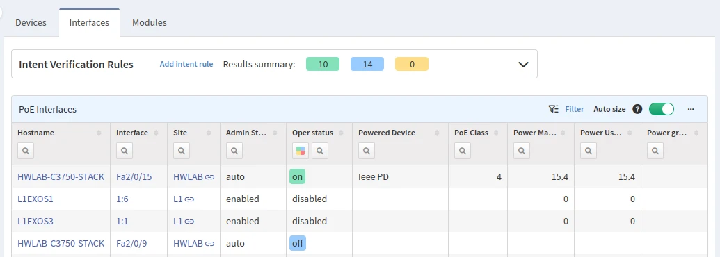 The Interfaces tab lists all interfaces that support the PoE protocol. Filters