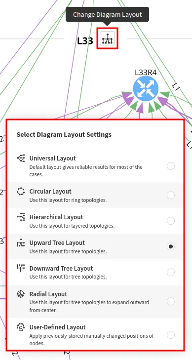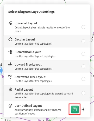 After editing the layout, you will see the green box. This allows you to save the changes as the default view. Click the green box; this will open a menu Select Diagram Layout Settings, and the last entry is the User-Defined Layout. By clicking the Floppy disk icon, you will update the default view (see below). Please be aware that only the position of the visible nodes will be saved.