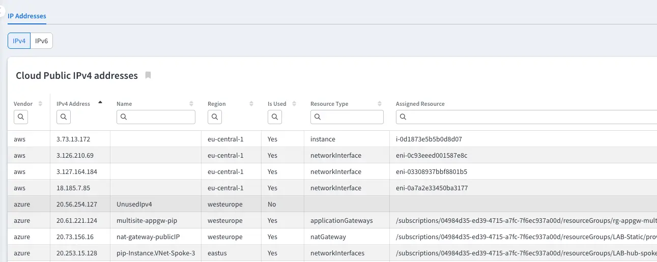 Public IPs There are two tables that provide a list of all IPv4 and IPv6 public IP addresses created in public clouds. They show the IP name, region, information on whether the public IP is in use, and, if so, the related resource type and ID. Was this page helpful? Thanks for your feedback! Thanks for your feedback! Help us improve this page by using our support portal.