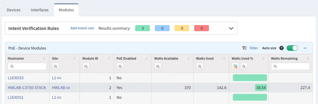 The Modules tab shows the PoE module statistics. This table is especially significant because it shows the used power consumption in watts, percentage, and how many watts are left.