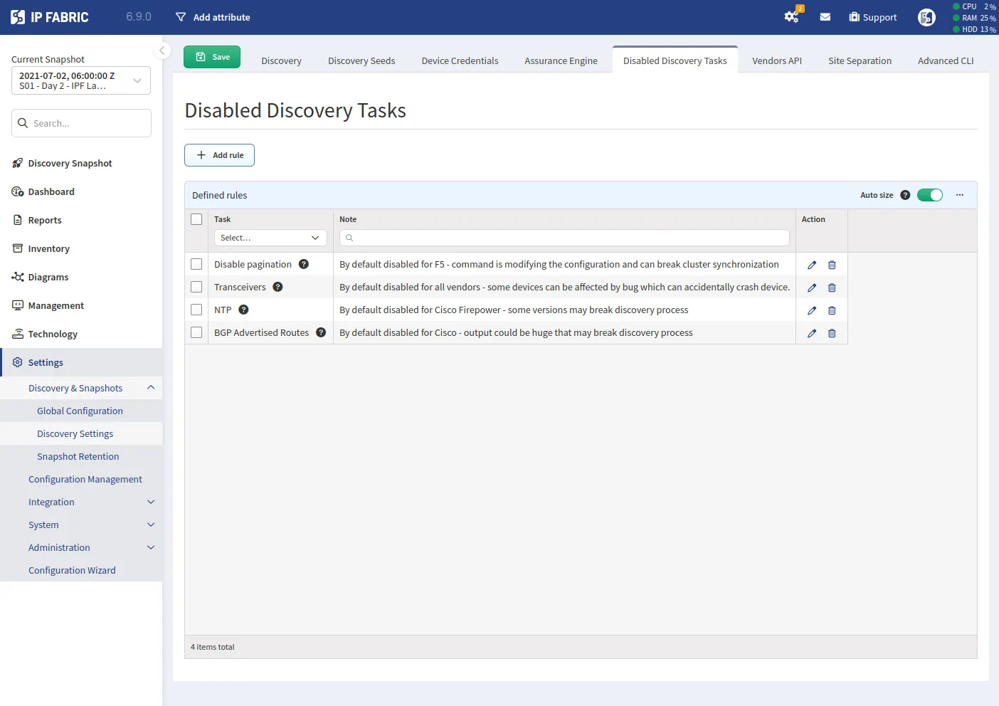 Disabling Tasks will reduce the level of information collected by IP Fabric. If some fundamental Tasks are disabled, it can affect the topology or path lookup results.