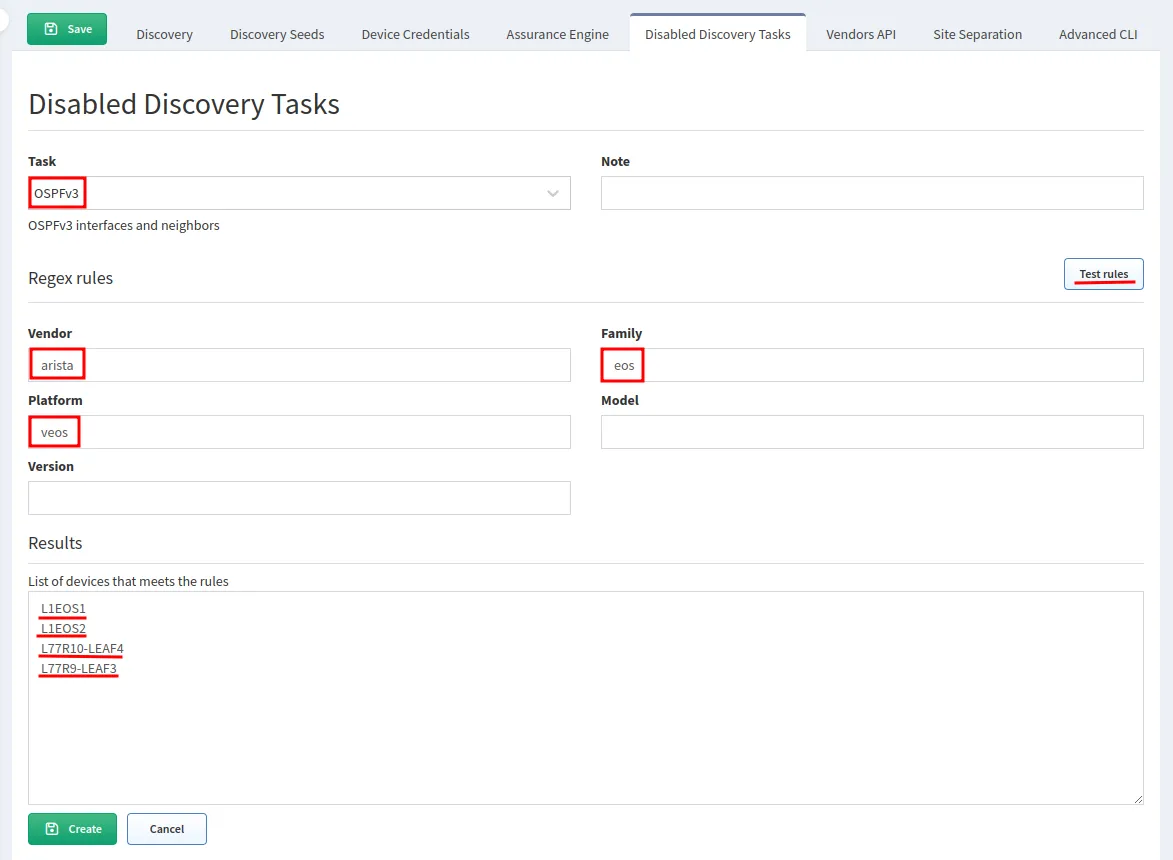 In the following example, we are creating a rule for disabling OSPFv3 on Arista vEOS. The test for the rule reveals 4 matches.
