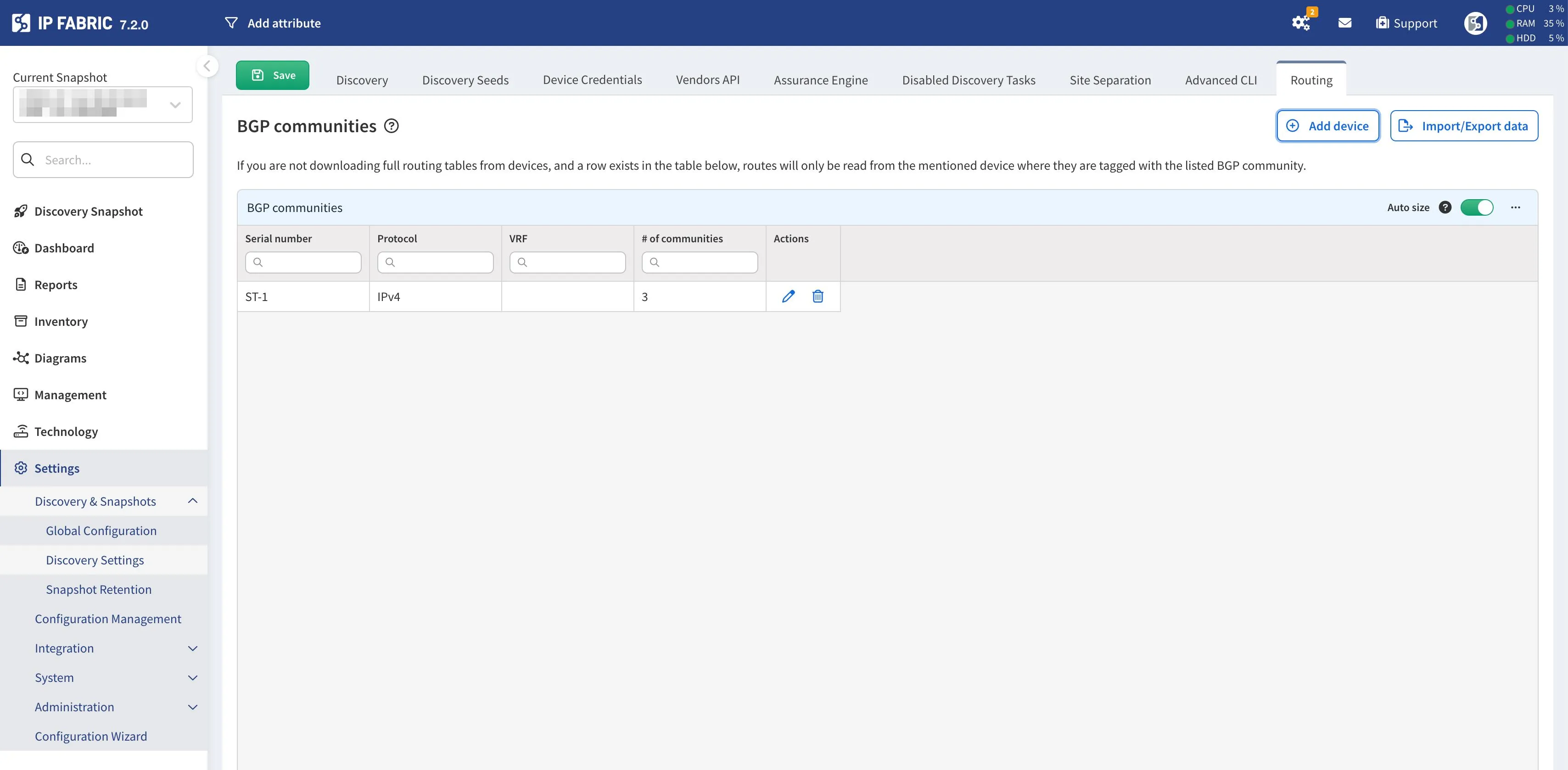When present, BGP communities override thresholds. The system:- Downloads all routes matching community filters (on Cisco IOS-XR router, processing a large number of routes in the community may take some time)