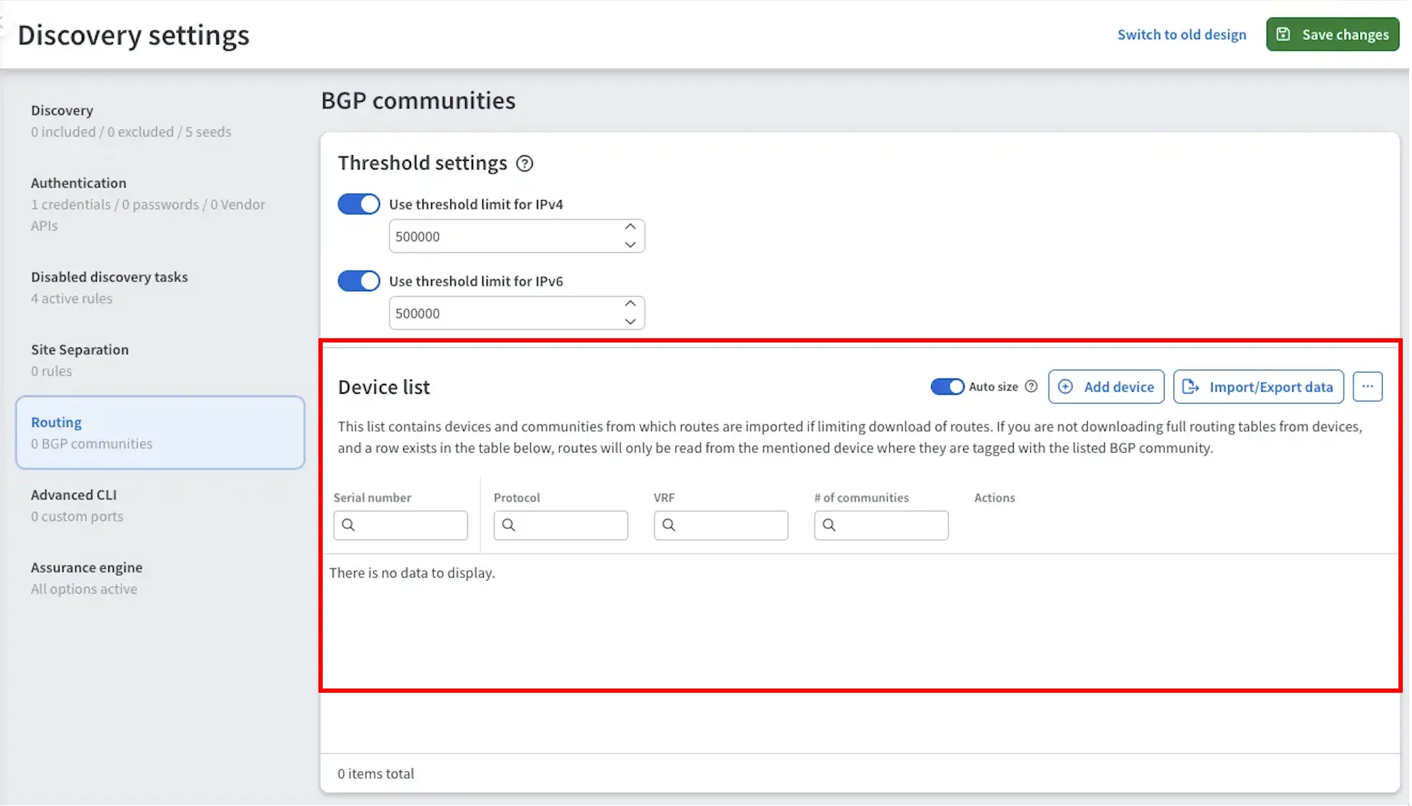 A global limit for BGP route downloads can be set in Discovery settings under Limit download BGP routes.