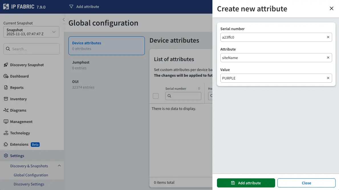 Attributes can be assigned globally or locally to an individual snapshot. To assign global attributes, navigate to Settings → Discovery & Snapshots → Global Configuration → Device Attributes. Once an attribute is assigned, a new snapshot is required for it to be applied.