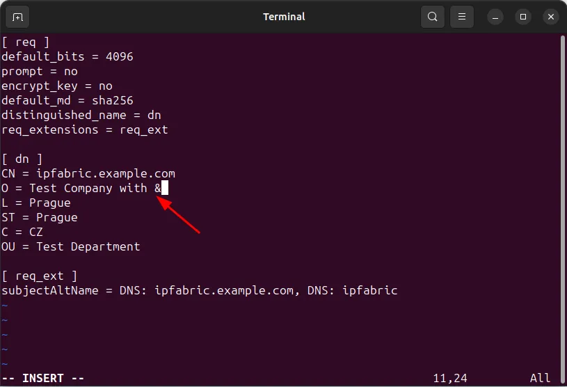 customer.conf(for example withvi customer.conf; in our example, we changedTest Company withtoTest Company with &): -