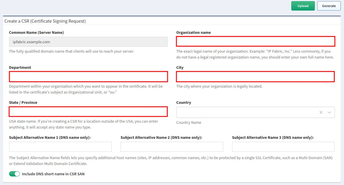 Short Subject Alternative Names (only hostnames without a domain name) are not accepted by all CAs (Certificate Authorities). To remove it from the CSR, switch off the Include DNS short name in CSR SAN toggle.