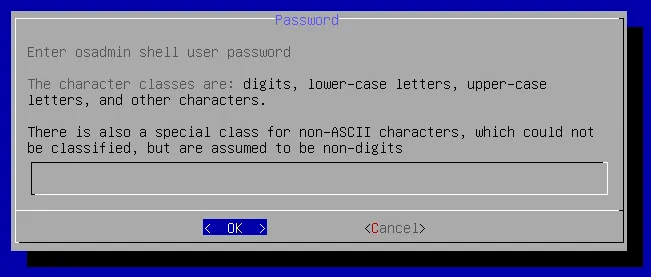 osadminpassword twice:Password setup contains password complexity check; simple passwords are rejected.