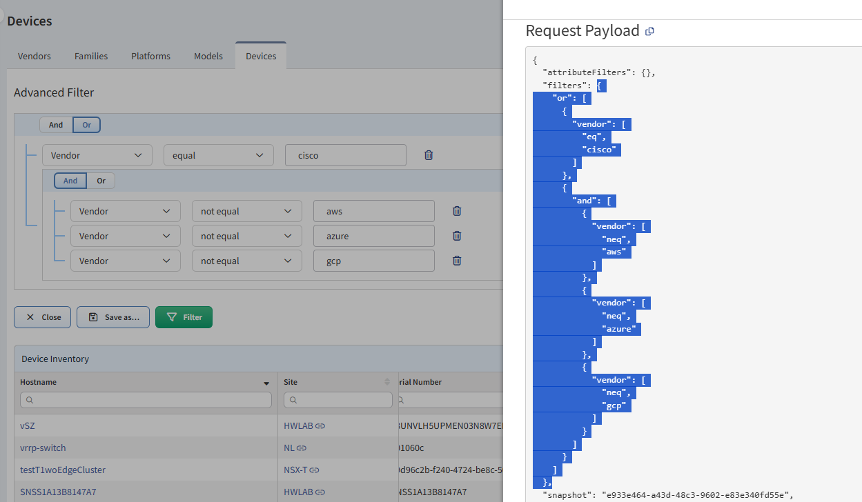 The below example will have 0 inventory devices since the cisco vendor is filtered out in the global inventory.