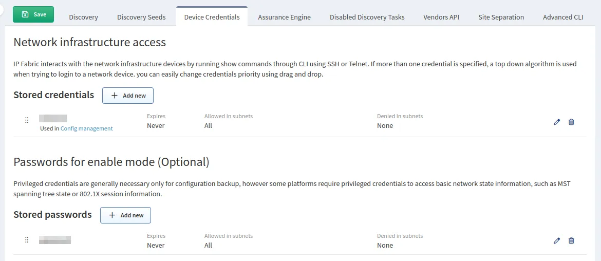 Authentication is where you define the username and password IP Fabric uses to