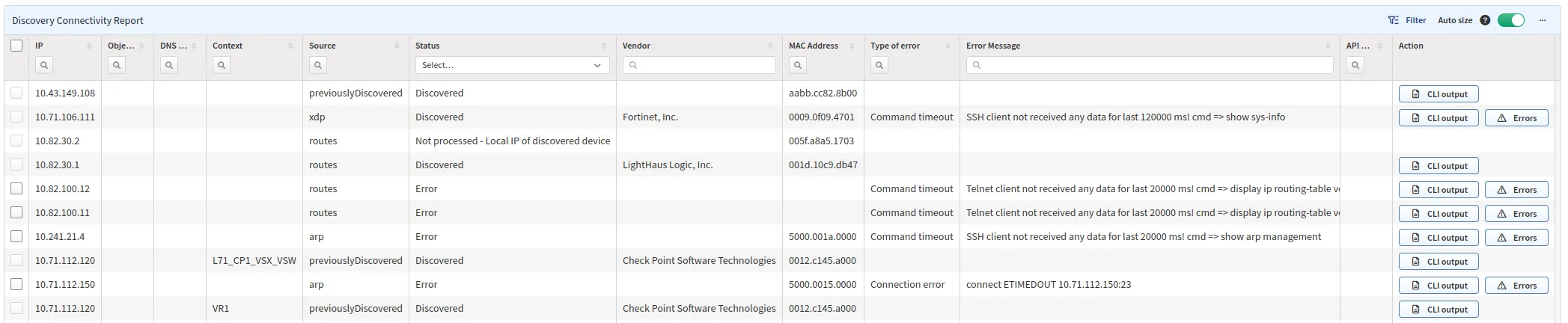 The Connectivity Report is a per-snapshot report stating successes or errors for IP addresses that IP Fabric tried to discover. Once you have a list of IP addresses from the unmanaged neighbor tables above or perhaps an external Network Management System, this is where you would start your troubleshooting process.