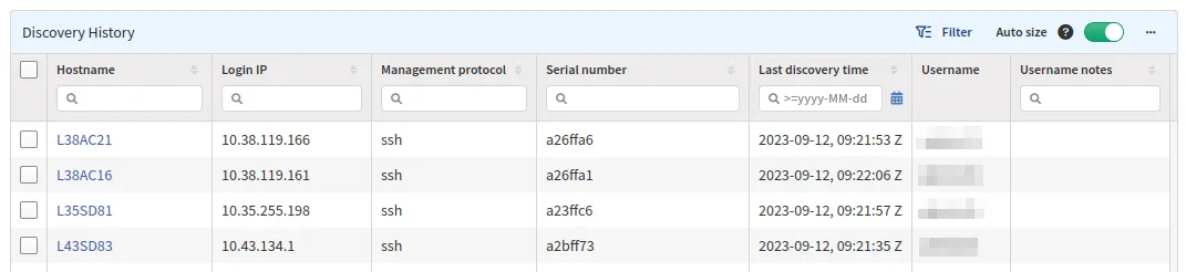 - The username last successfully used for a device will be recorded here and be the first one tried in a future snapshot. If unsuccessful, IP Fabric will check the list in Settings → Discovery & Snapshots → Discovery Settings → Device Credentials and go back through the decision tree. This may cause the next snapshot to take longer due to authentication failures, but once this table is updated with the new username, the discovery time will return to normal.