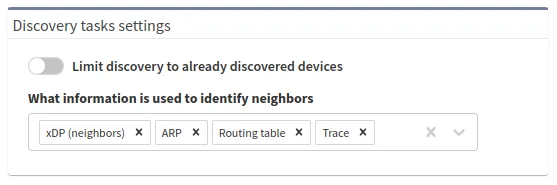 These are user-defined IP addresses that IP Fabric will try to connect to and discover. If a device is successfully discovered, it will check the settings in the Discovery tasks settings to see what technologies to use to discover neighbors.