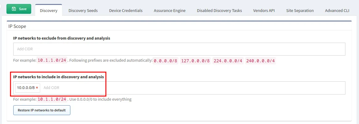 IP Scope tells IP Fabric which networks to include or exclude in the discovery