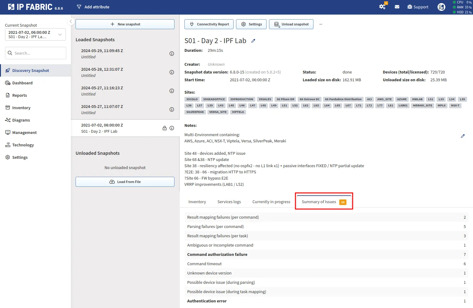 Each snapshot under the Discovery Snapshot menu has a Summary of Issues tab: