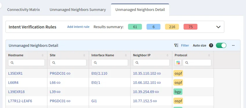 This table displays unmanaged neighbors based on various protocols and includes a built-in default intent check for you.