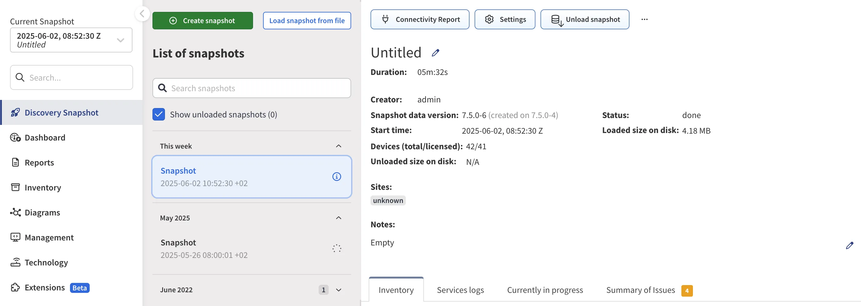 Snapshots can be cloned to accommodate change management practices. For example, when change comparison is desired but only a small part of the network is affected by the change. A snapshot can be restricted to a specific portion of the network through IP Scope in Settings → Discovery & Snapshots → Discovery Settings → Discovery. This will enable visual comparison of a portion of the network and provide historical data for the collected portion of the network. However, when comparing a partial snapshot with a full snapshot, many false positives will appear because a large portion of the network will be missing.