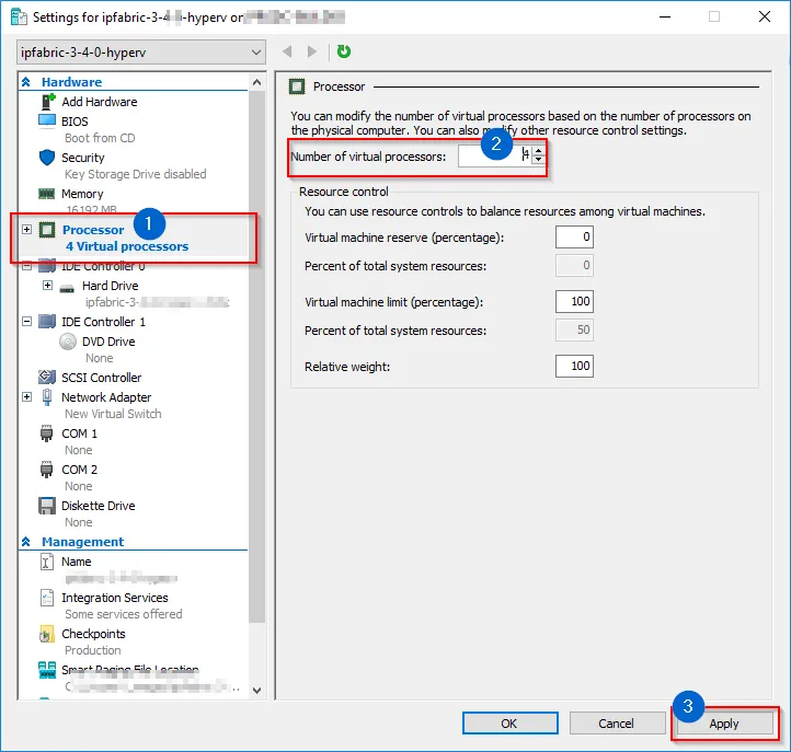 In Processor, configure the required number of vCPUs according to the Hardware Requirements.