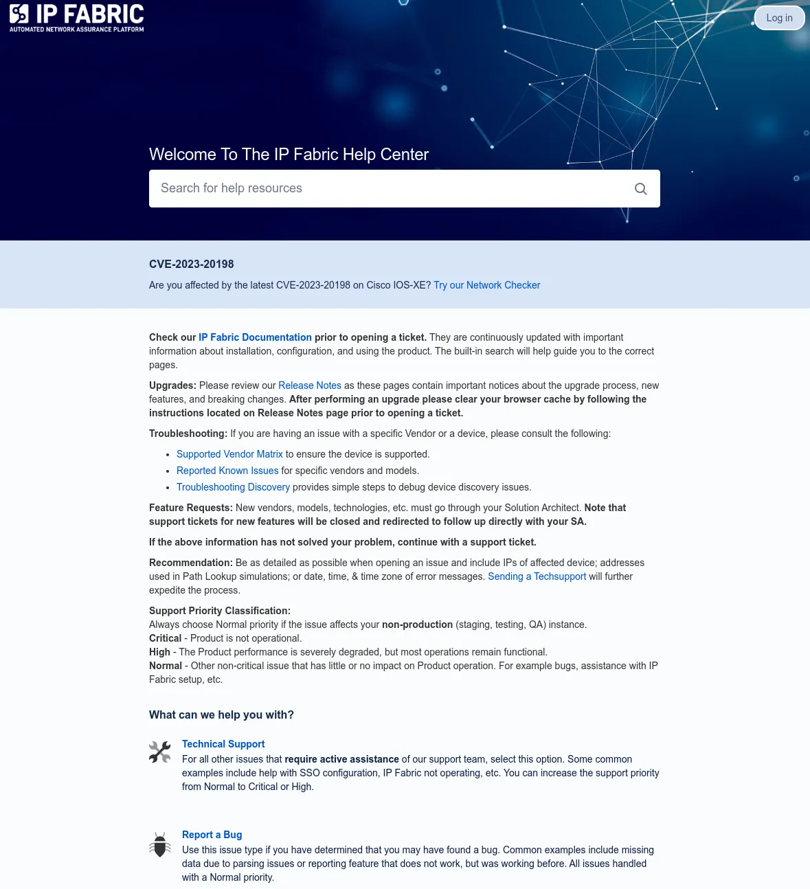 This is the support portal from which you can contact our Support team in case of any issues with IP Fabric.