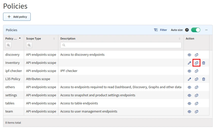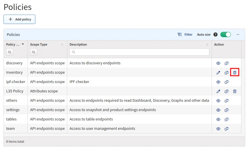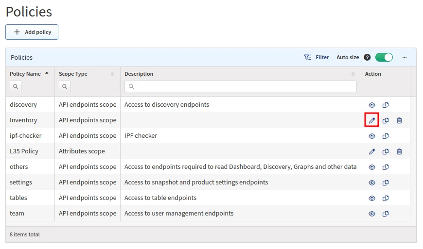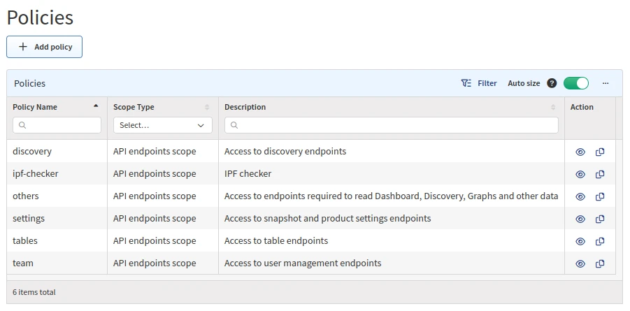 API endpoints scope defines actions that are permitted for end users to perform on allowed devices or on the system. Access is defined only to a specific API endpoint within IP Fabric (e.g., a discovery policy allows access to discovery API endpoints (actions)).