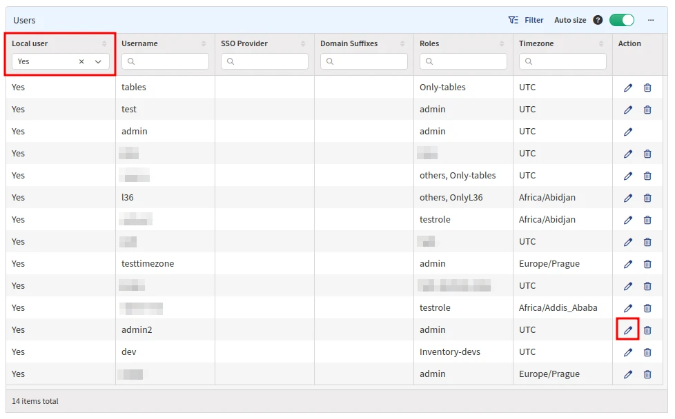 Userstable and click the Edit icon. (Optionally, you may selectYesin theLocal usercolumn header to show only local users.) -