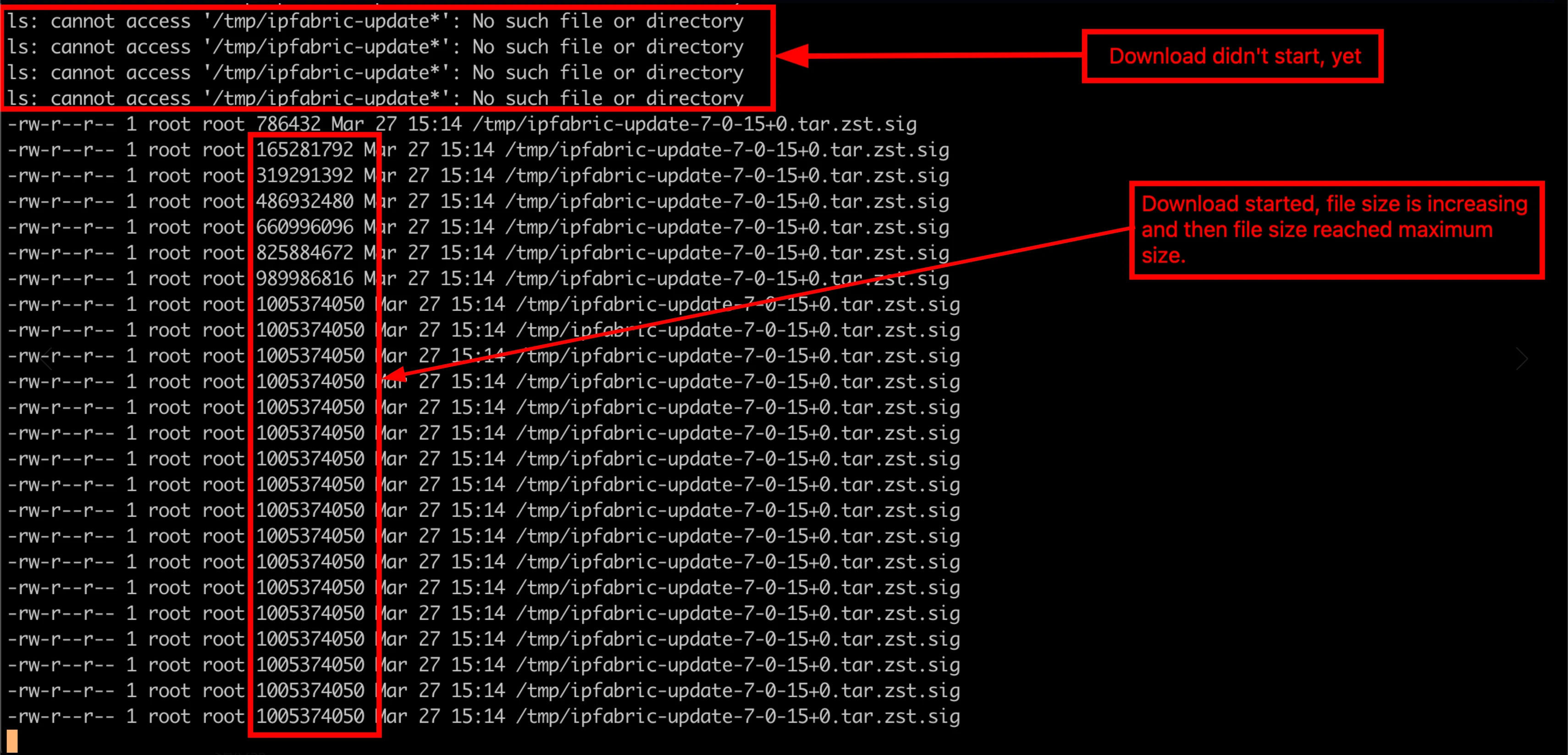 while true; do ls -l /tmp/ipfabric-update*; sleep 2; done:
