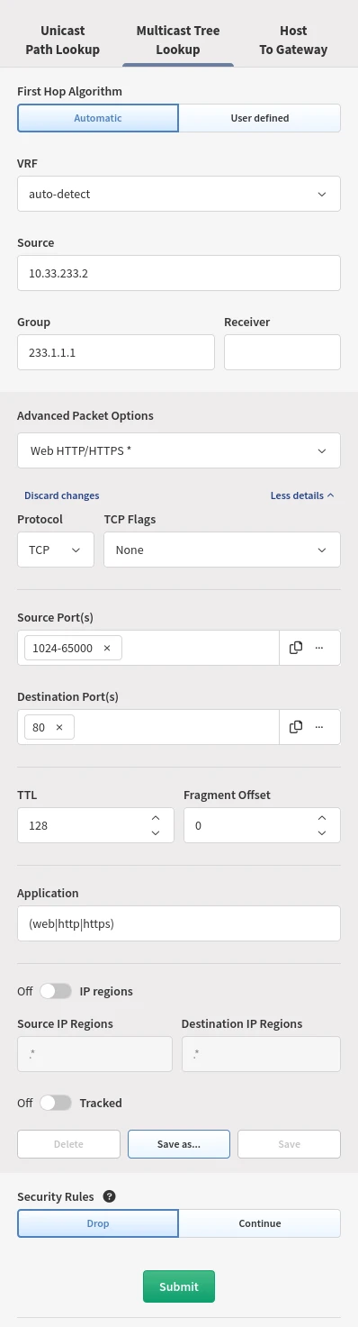 If you want to understand how a certain multicast flow is used, you can use the Multicast Tree Lookup tab. Just select the correct option and enter the relevant details.