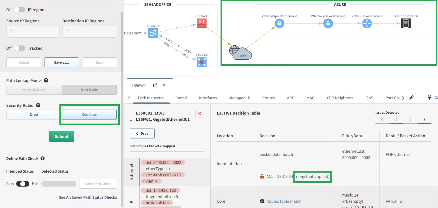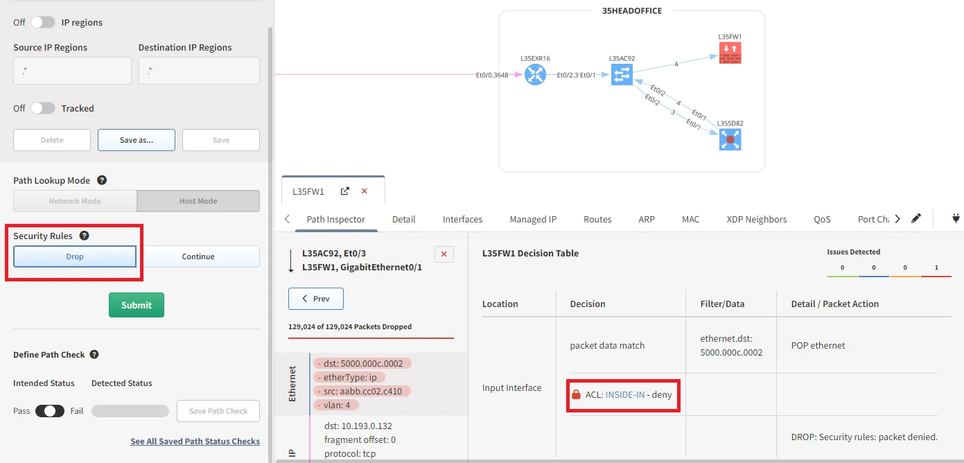 If Drop is selected, the path lookup will stop when a security rule denies traffic.
