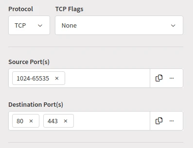 When switched to Web HTTP/HTTPS, TCP destination ports 80 and 443 with the (web|http|https) application are set by default.