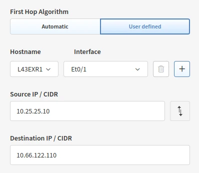 The User defined First Hop Algorithm can be useful when simulating a flow where the source network is not known by IP Fabric.