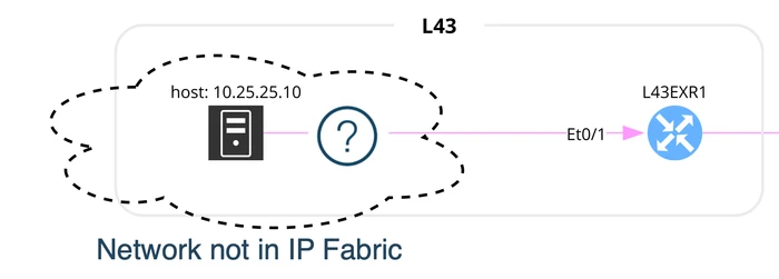 In the example below, the source network 10.25.25.0/24 is not known by IP Fabric. To show the path between a client in this network and a server in a network known by IP Fabric: