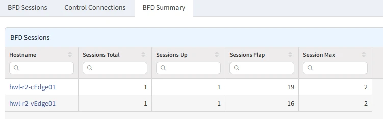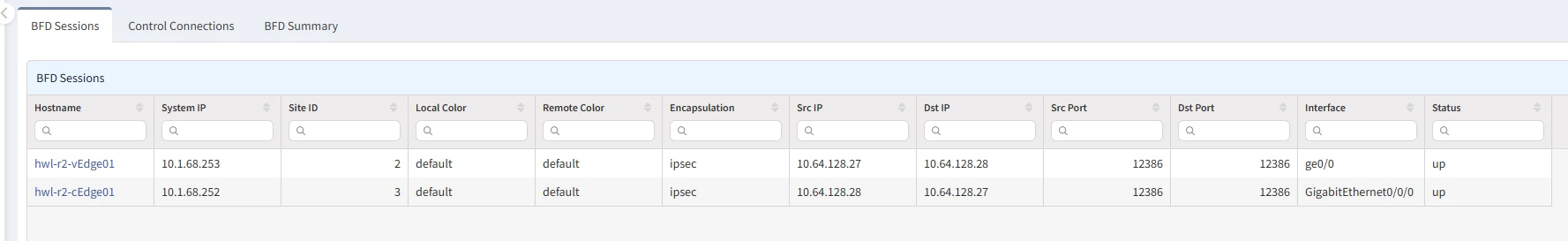 Viptela BFD Sessions The BFD Sessions tab contains the list of data plane connections. Control Connections The Control Connections tab contains the list of control plane connections. BFD Summary The BFD Summary tab contains summary of BFD sessions. Was this page helpful? Thanks for your feedback! Thanks for your feedback! Help us improve this page by using our support portal.