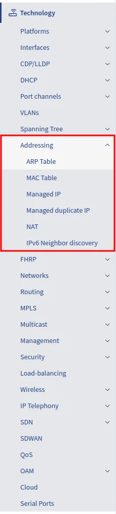 The Addressing section provides information about every IP address on every managed network infrastructure device.