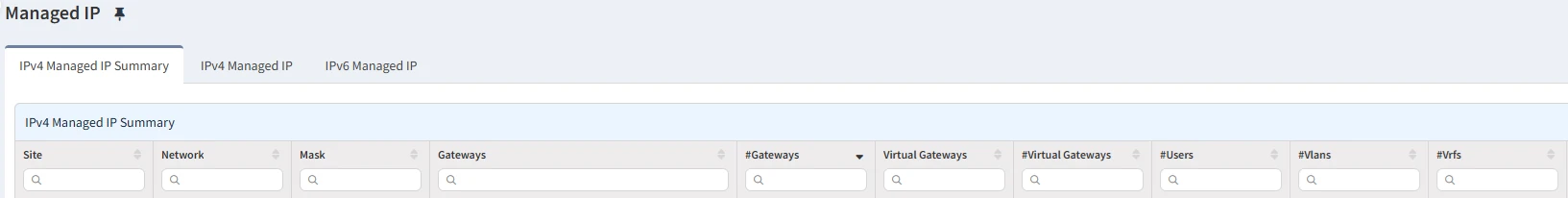 The IPv4 Managed IP Summary table provides a comprehensive overview of sites and their IPv4 subnets. For each subnet, it displays: