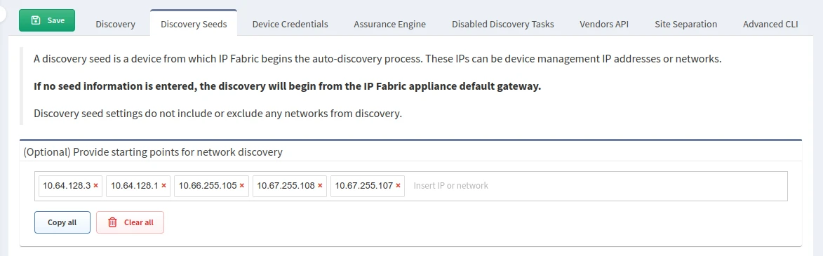 A discovery seed is a device from which IP Fabric begins the auto-discovery process. These IPs can be device management IP addresses or networks.