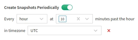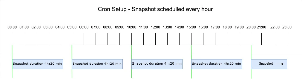 Let’s assume that a snapshot is scheduled for every hour, and it takes 4 hours and 20 minutes to be created. Then, the next snapshot will be scheduled once the previous snapshot finishes. The scheduled time will be set at the next possible period according to the cron setup.
