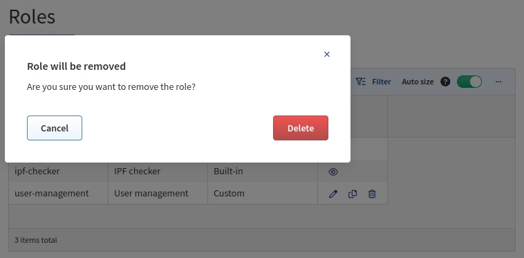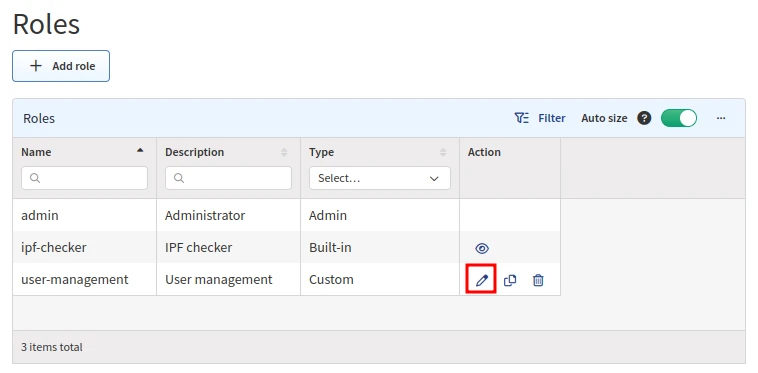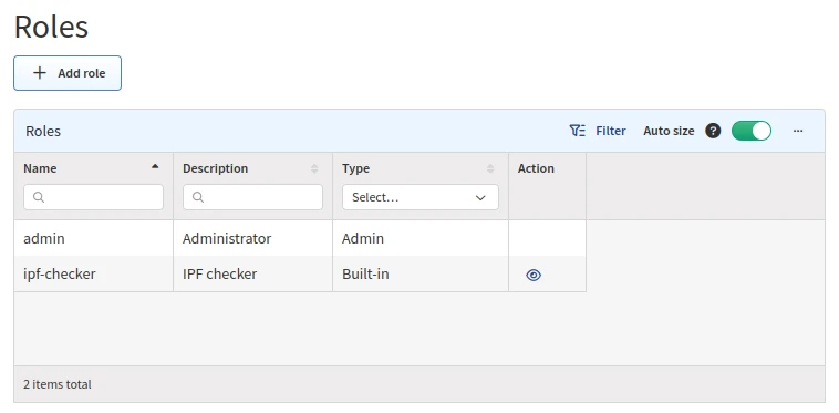The Roles table lists all roles, including their details, and allows you to modify or delete them (except for the built-in admin and ipf-checker roles, which cannot be modified nor deleted).