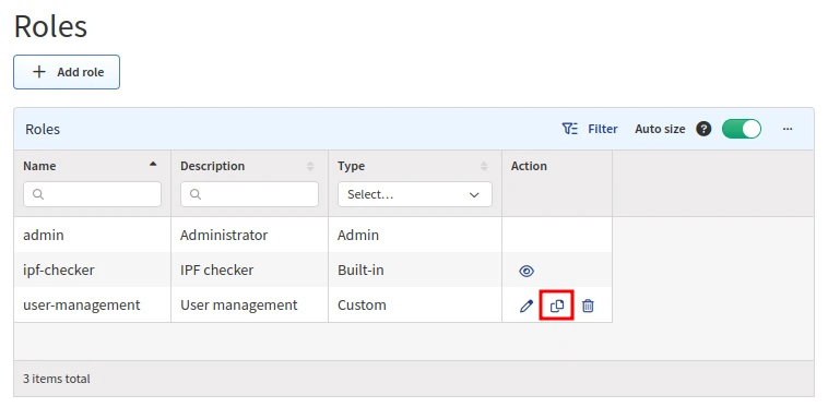 1. To copy a role, click the Copy icon next to it in the Roles table: