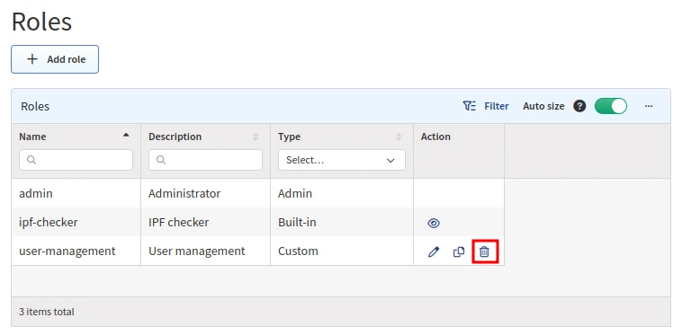 1. To delete a role, click the Delete icon next to it in the Roles table: