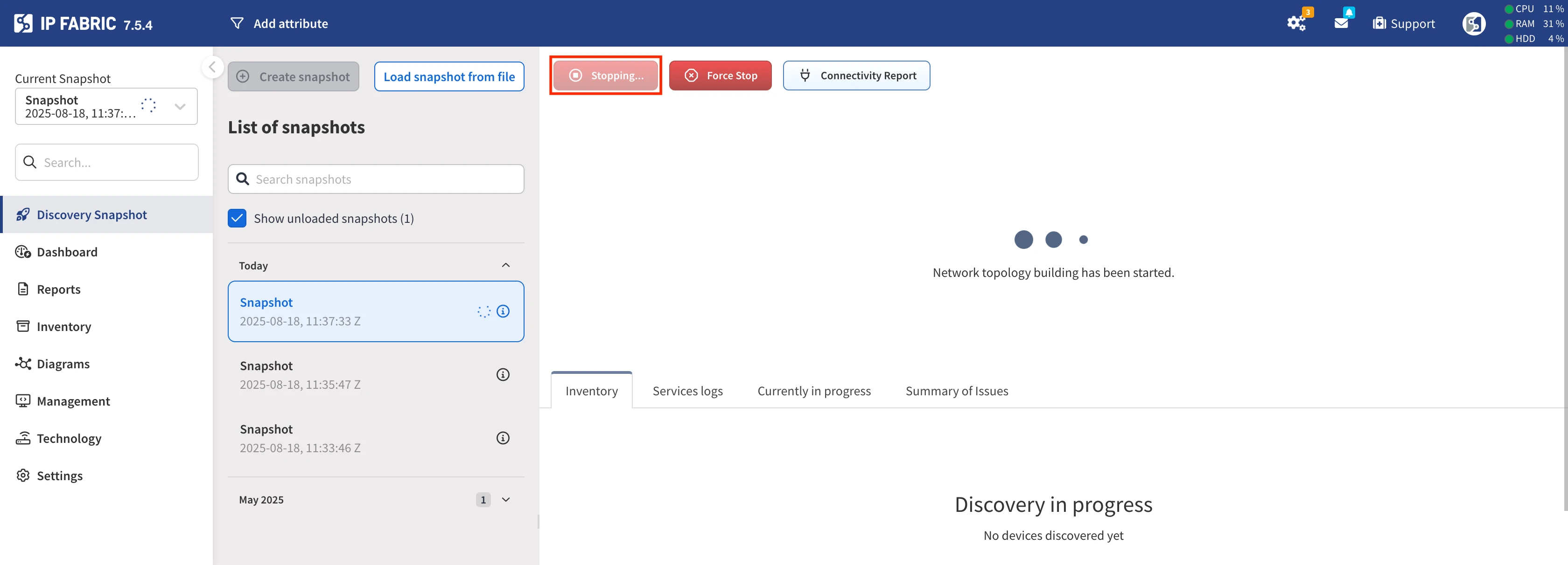Before creating a new snapshot, IP Fabric performs the following resource checks (if any of them fails, a new snapshot won’t be created):