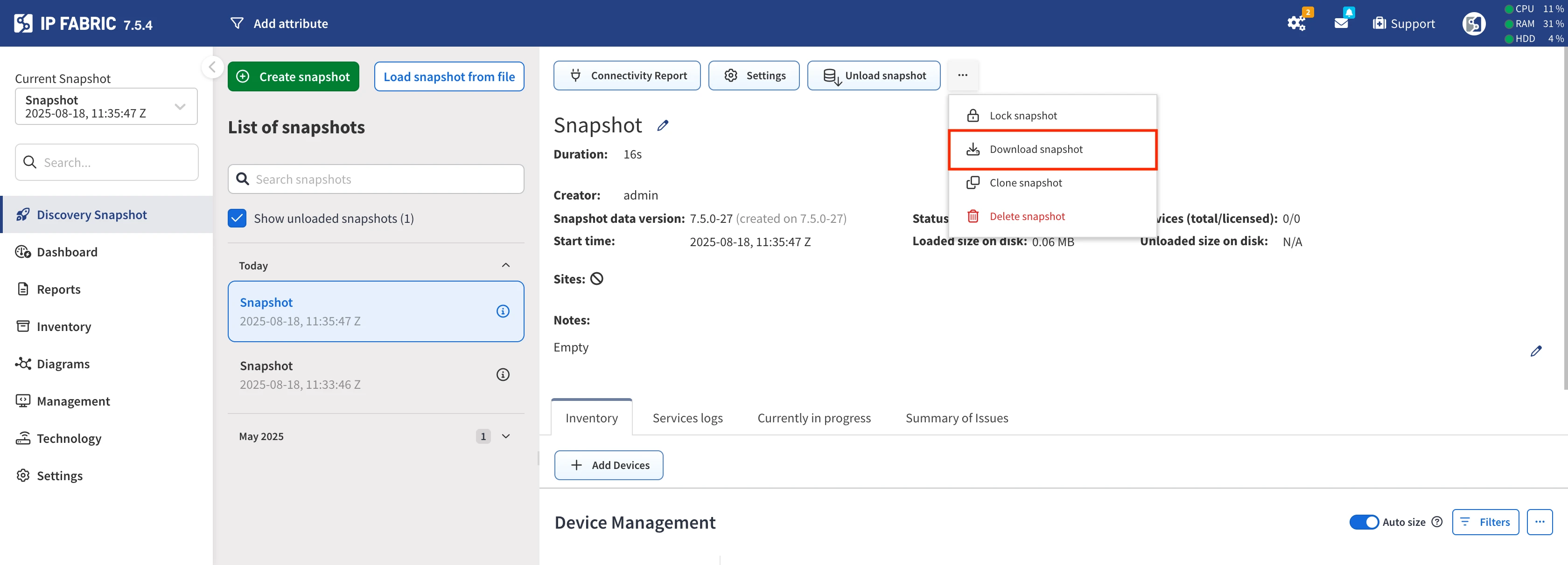 If needed, a selected snapshot can be downloaded from IP Fabric to your local storage by selecting Download snapshot.