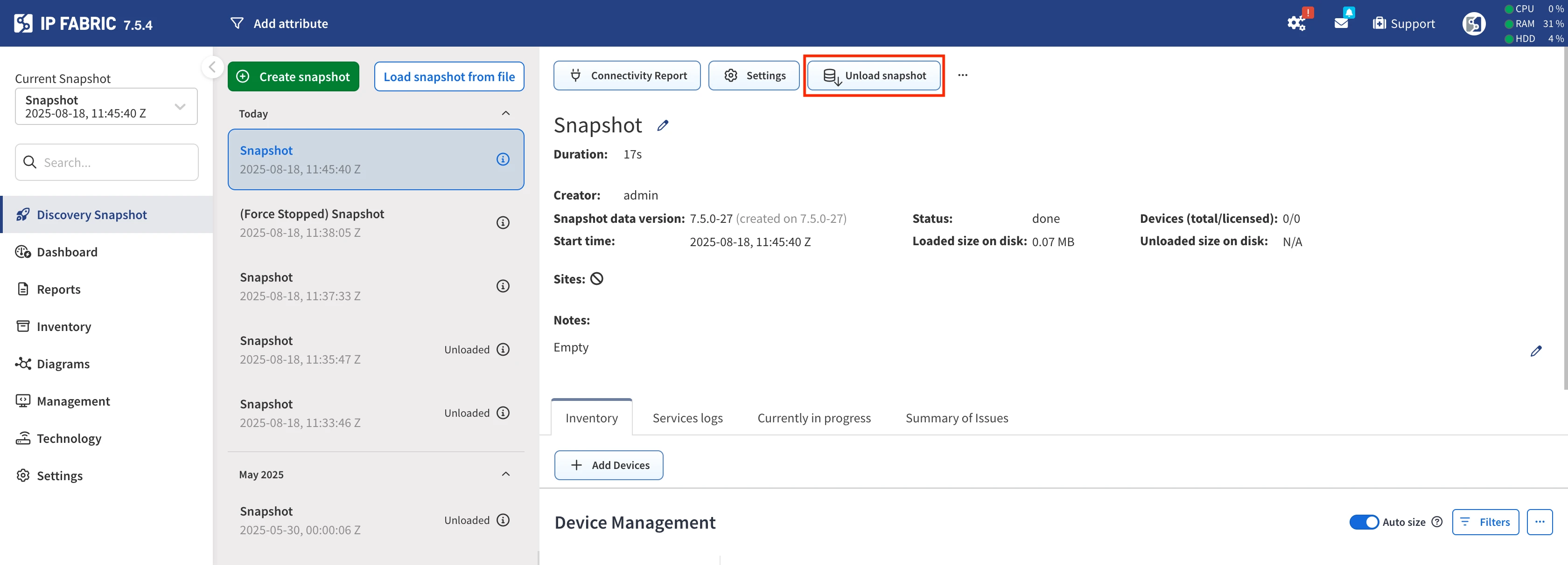 When a snapshot is unloaded, it is safely stored on the hard disk, but the data from that snapshot cannot be accessed directly through the IP Fabric user interface. To browse an unloaded snapshot, it needs to be loaded again to memory by clicking Load snapshot.