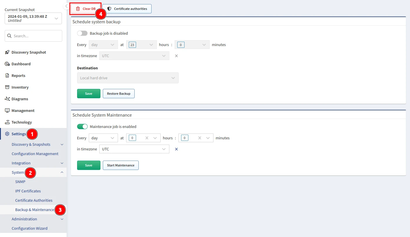 In rare cases, it might be necessary to delete and recreate the IP Fabric database. To do that, navigate to Settings → System → Backup & Maintenance and click Clear DB.