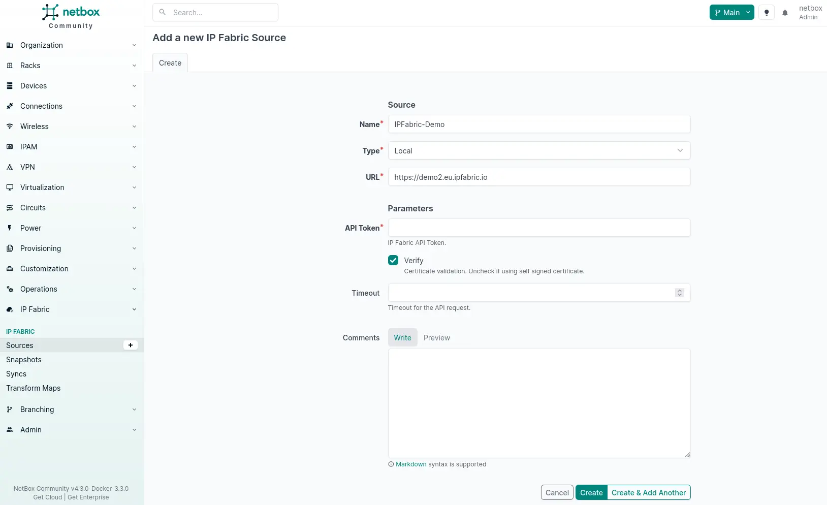 To create a source, navigate to Plugins → IP Fabric → Sources → [ + ]. In our case, the source is set to Local. If type is set to Remote, data for the snapshots will need to be pushed via API. The API endpoint to do this can be seen in the NetBox OpenAPI spec.