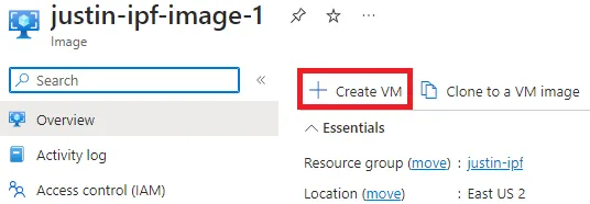 After creating the Image (for NVMe deployments), go to the respective resource and select Create VM: