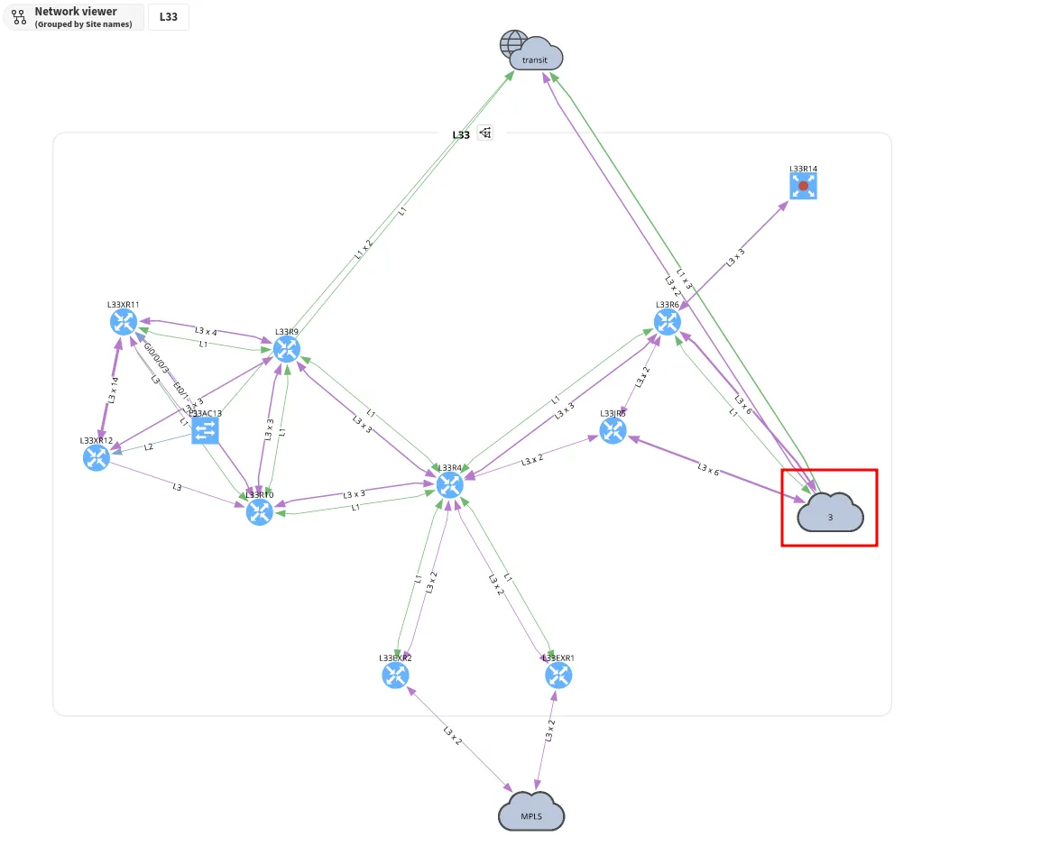 When you go to Diagrams → Network, all networks are displayed along with the relationships between them. They are grouped into sites (which are represented by clouds) for better visibility. You can double-click a cloud to explore further that specific site.