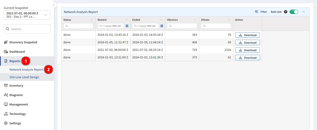Reports → Network Analysis Report documents provide an overview of the current network performance, capacity, and risks. They also offer technical details of the top issues in each category.